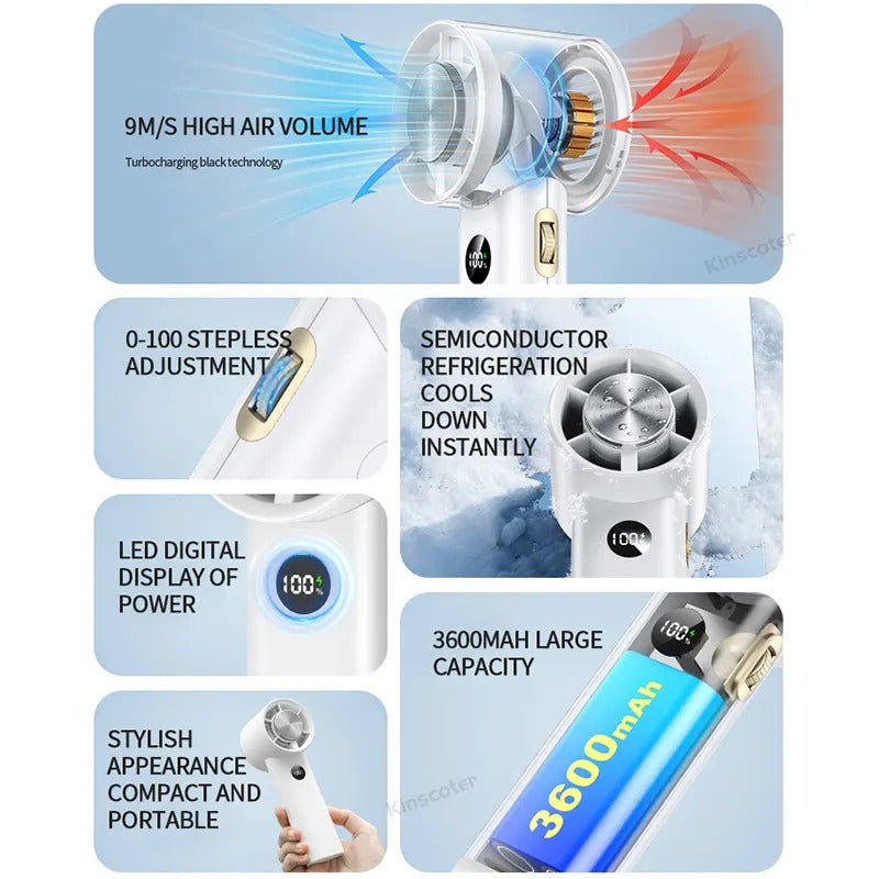 Beat the heat in style with this ultra-modern Mini Handheld Turbo Fan, featuring a powerful turbo-style airflow system and sleek, minimalist design. Compact yet efficient, it’s perfect for on-the-go cooling whether you're traveling, commuting, or just relaxing outdoors. With a front-facing digital battery display, one-touch operation, and whisper-quiet performance, this fan is a smart and stylish solution to stay cool anywhere, anytime.