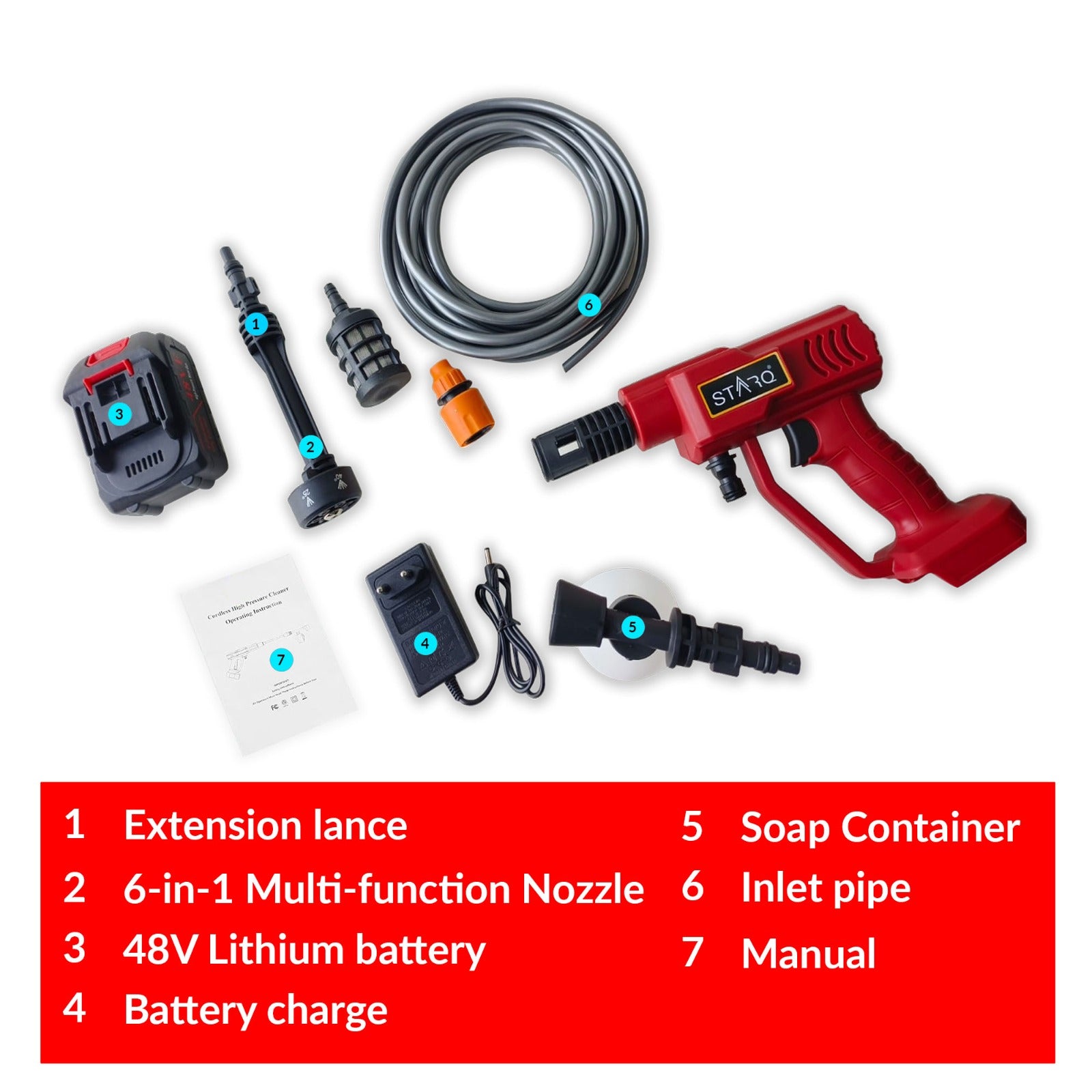 STARQ Turbowash Cordless Portable 48V Wireless Pressure Washer Gun - 12000mAh High Pressure Water Gun for Car and Bike Wash, Adjustable 6 in 1 Nozzle, 5M Hose Pipe, (Single Battery with Charger)