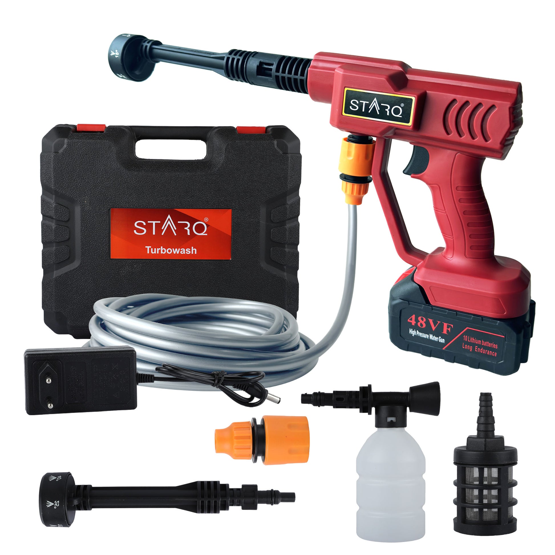 - Powerful, portable, and cordless—the StarQ TurboWash is perfect for cleaning cars, bikes, patios, and more. With a high-pressure spray, 6-in-1 adjustable nozzle, and self-priming design, it draws water from any source. Lightweight and rechargeable, it's your go-anywhere cleaning solution.